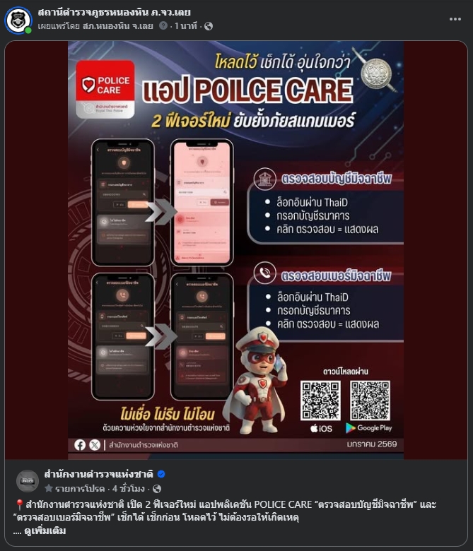 สำนักงานตำรวจแห่งชาติ เปิด 2 ฟีเจอร์ใหม่ แอปพลิเคชัน “POLICE CARE”“ตรวจสอบบัญชีมิจฉาชีพ” และ “ตรวจสอบเบอร์มิจฉาชีพ” แนะเช็กก่อน โหลดไว้ ไม่ต้องรอให้เกิดเหตุวันนี้ (29 มกราคม 2569) พล.ต.อ.นิรันดร เหลื่อมศรี รองผู้บัญชาการตำรวจแห่งชาติ (รอง ผบ.ตร.) รับผิดชอบงานกฎหมายและคดี เปิดเผยว่า สำนักงานตำรวจแห่งชาติได้เปิดตัว “POLICE CARE” แอปพลิเคชันตำรวจสำหรับประชาชน ให้เป็นของขวัญปีใหม่ 2569 ไปแล้ว โดยแอปพลิเคชัน POLICE CARE มีฟีเจอร์หลัก บริการของตำรวจเพื่อประชาชนในด้านต่าง ๆ ไม่ว่าจะเป็นการให้ความรู้กฎหมาย การเตรียมตัวไปแจ้งความ เตือนภัย ค้นหาสถานีตำรวจใกล้ฉัน คู่มือประชาชน แจ้งอายัดบัญชี แจ้งความออนไลน์ ตรวจสอบเจ้าหน้าที่ตำรวจ ตรวจสอบข้อมูลใบสั่ง ข้อมูลคดี ซึ่งประชาชนสามารถเข้าไปดูข้อมูลต่าง ๆ ได้อย่างสะดวกรวดเร็ว นอกจากนี้ เพื่อให้ครอบคลุมทุกบริการ เป็นแอปพลิเคชันตำรวจแบบครบวงจร ครบ จบ ที่แอปเดียว ล่าสุด “POLICE CARE” เปิด 2 ฟีเจอร์ใหม่ คือ “ตรวจสอบบัญชีมิจฉาชีพ” และ “ตรวจสอบเบอร์มิจฉาชีพ” สามารถใช้งานได้แล้ว รอง ผบ.ตร. เปิดเผยว่า สำนักงานตำรวจแห่งชาติตั้งใจให้ POLICE CARE เป็นแอปพลิเคชัน ONE STOP SERVICE ของประชาชน ด้วยความห่วงใย พล.ต.อ.กิตติ์รัฐ พันธุ์เพ็ชร์ ผู้บัญชาการตำรวจแห่งชาติ มีนโยบายให้พัฒนาแอปพลิเคชันนี้เป็นตัวช่วยในเรื่องการป้องกันภัยอาชญากรรมที่อาจเกิดขึ้นกับประชาชนได้ด้วย ซึ่งสำนักงานตำรวจแห่งชาติให้ความสำคัญกับภัยออนไลน์จากสแกมเมอร์ที่มาหลากหลายรูปแบบ สำนักงานตำรวจแห่งชาติจึงพัฒนาเพิ่ม 2 ฟีเจอร์ ในแอปพลิเคชัน POLICE CARE ที่เชื่อมโยงฐานข้อมูลแจ้งความออนไลน์ มีฐานข้อมูลหมายเลขบัญชีมิจฉาชีพ และฐานข้อมูลเบอร์โทรมิจฉาชีพ เพื่อให้ประชาชนตรวจสอบก่อนเกิดเหตุ ยับยั้งภัยสแกมเมอร์ ทั้งนี้ ผู้ใช้งานสามารถเข้าไปที่หน้าแอปพลิเคชัน POLICE CARE แล้วเข้าไปตรวจสอบข้อมูลของฉัน จากนั้นต้องล็อกอินผ่าน ThaiD ก่อน เพื่อความปลอดภัยของผู้ใช้งานและความปลอดภัยในการเข้าถึงข้อมูล แล้วสามารถกรอกเบอร์โทร หรือเลขบัญชีต้องสงสัย ระบบจะประมวลผลอย่างรวดเร็ว บอกว่าเป็นเบอร์โทรหรือบัญชีธนาคารของมิจฉาชีพหรือไม่ กรณีเป็นบัญชีธนาคารจะขึ้นข้อความแจ้งเตือนว่า “มิจฉาชีพ” “อันตราย! ห้ามโอนเด็ดขาด” พล.ต.อ.นิรันดรฯ กล่าวอีกว่า สำนักงานตำรวจแห่งชาติอยากให้ประชาชนโหลดแอปพลิเคชัน “POLICE CARE” ไว้ในโทรศัพท์มือถือ โหลดไว้อุ่นใจ ไม่ต้องรอให้เกิดเหตุ เสมือนมีตำรวจอยู่ใกล้ตัว และรับรองว่าแอปพลิเคชันนี้มีความปลอดภัย มีทั้งฟีเจอร์ที่เป็นประโยชน์ และข้อมูลสำคัญที่ต้องรู้ โดยสา